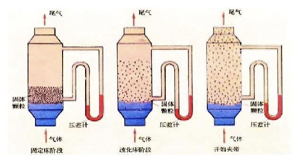 将一批固体颗粒堆放在多孔的分布板上形成床层,使流体自下而上通过床层。由于流体的流动及其与颗粒表面的摩擦,造成流体通过床层的压力降。当流体通过床层的表观流速(按床层截面计算的流速)不大时,颗粒之间仍保持静止和互相接触,这种床层称为固定床。当表观流速增大至起始流化速度时,床层压力降等于单位分布板面积上的颗粒浮重(颗粒的重力减去同体积流体的重力),这时颗粒不再相互支撑,并开始悬浮在流体之中。进一步提高表观流速,床层随之膨胀,床层压力降近乎不变,但床层中颗粒的运动加剧。这时的床层称为流化床。当表观流速增加到等于颗粒的自由沉降速度时,所有颗粒都被流体带走,而流态化过程进入输送阶段。