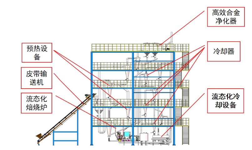3、物料焙烧:来自高效合金净化器和预热过滤器捕集下的物料经过管路输送,与二级物料预热器预热后的物料一起进入到流态化焙烧炉中进行高温焙烧。焙烧完成后的物料随热气流进入焙烧分离器中,生产物料在焙烧分离器中得到分离。