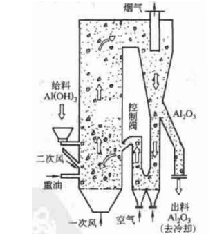 1、循环炉的核心部分是由反应器和旋风筒组成的再循环系统。燃料从反应器的下部喷入燃烧提供热量。焙烧产品带出的热量,在流化床冷却机内由一次风和二次风将其冷却回收,旋风筒废气所带出的热量,用于两级预热干燥段的氢氧化铝预热干燥及部分物料结晶脱水,从而回收热量,降低热耗。