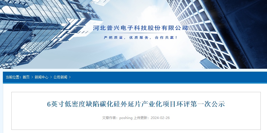中国粉体网讯 2月26日,河北普兴电子科技股份有限公司官网信息显示,公司“6英寸低密度缺陷碳化硅外延片产业化项目”进行了第一次环境影响评价信息公示。