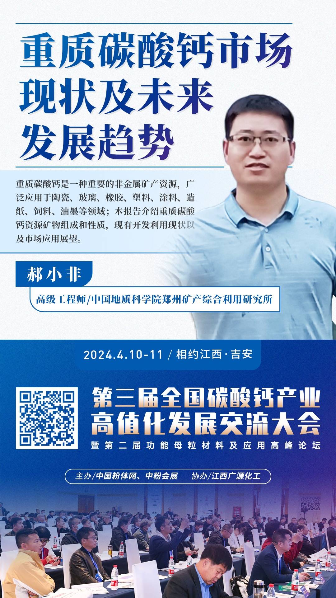 2024年4月10日~11日,第三届全国碳酸钙产业高值化发展交流大会将在江西·吉安举行,届时中国地质科学院郑州矿产综合利用研究所高级工程师郝小非将在大会上作《重质碳酸钙市场现状及未来发展趋势》主题报告,为大家介绍重质碳酸钙资源矿物组成和性质,现有开发利用现状以及市场应用展望。