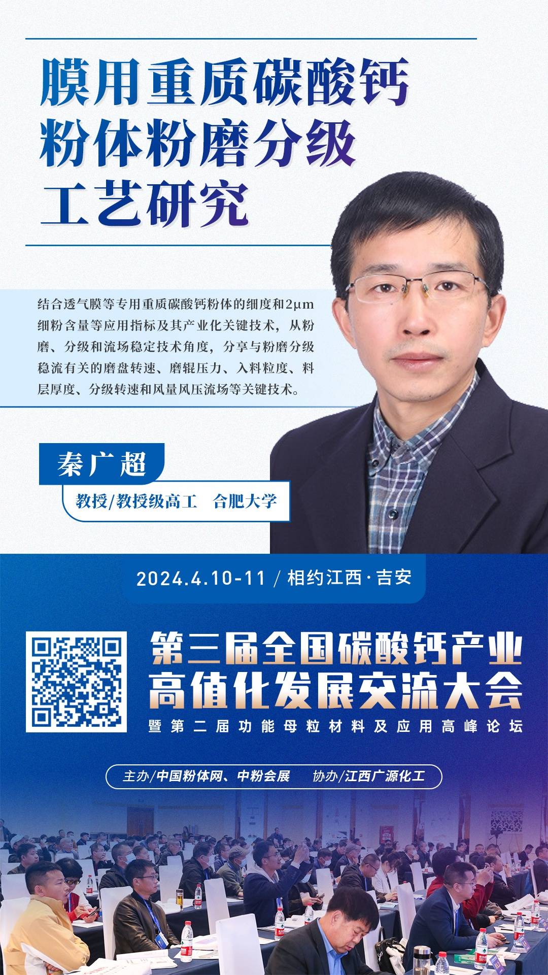2024年4月10日~11日,第三届全国碳酸钙产业高值化发展交流大会将在江西·吉安举行,届时合肥大学秦广超教授将在大会上作《膜用重质碳酸钙粉体粉磨分级工艺研究》主题报告,结合透气膜等专用重质碳酸钙粉体产业化关键技术,从粉磨、分级和流场稳定技术角度,为大家做专业讲解和汇报。
