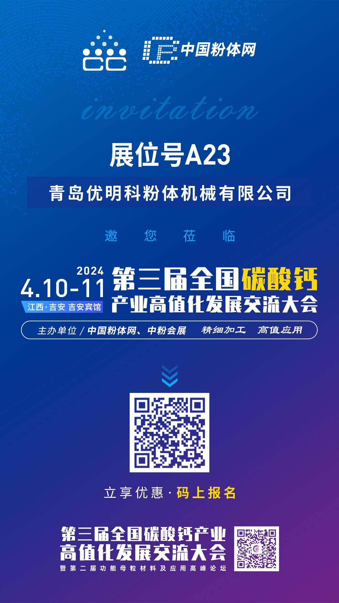 由中国粉体网主办的“2024第三届全国碳酸钙交流会”将于2024年4月10-11号在江西吉安举办,青岛优明科邀您一同参加。