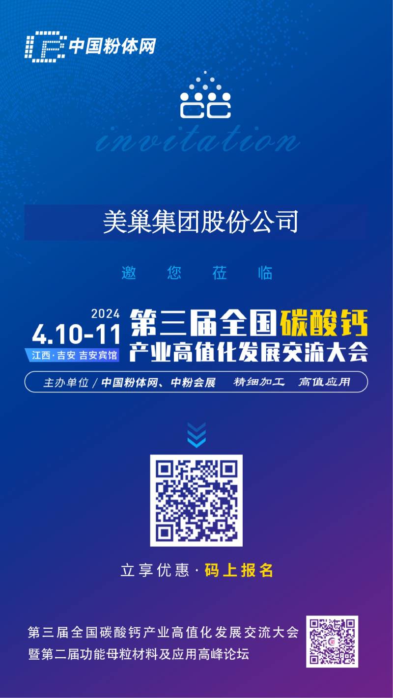 由中国粉体网主办的“2024第三届全国碳酸钙交流会”将于2024年4月10-11号在江西吉安举办,美巢集团股份公司邀您一同参加。