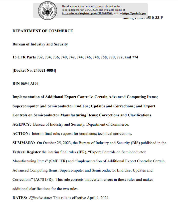 中国粉体网讯 刚刚美国商务部工业和安全局(BIS)对此前实施的半导体出口管制规则进行再次修订升级,旨在加大中国进口美国先进人工智能芯片的难度!新修订的规则将于4月4日生效。