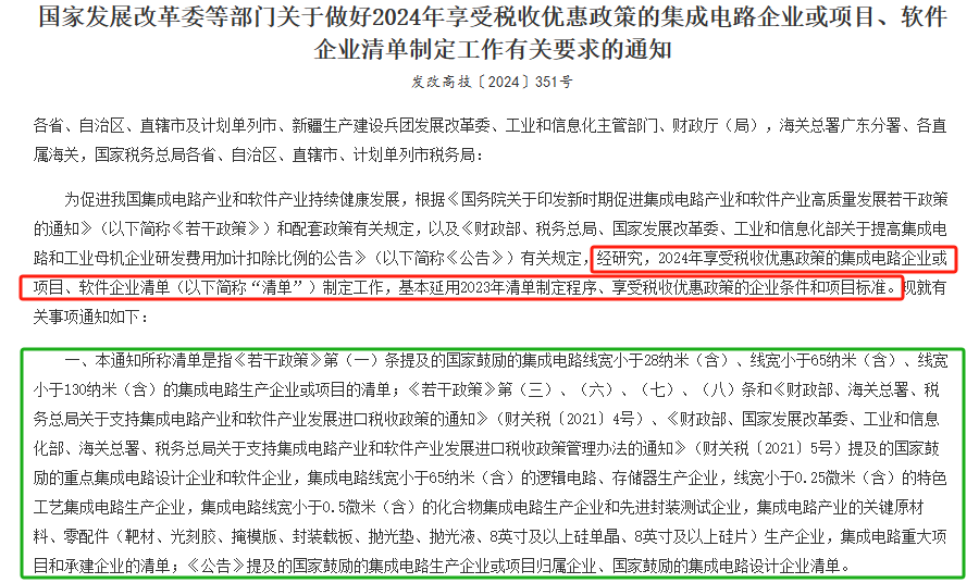 2024年3月22日,国家发展改革委等5部门联合发布新政策,用真金白银支持半导体企业发展!国家发展改革委等部门发布《关于做好2024年享受税收优惠政策的集成电路企业或项目、软件企业清单》。