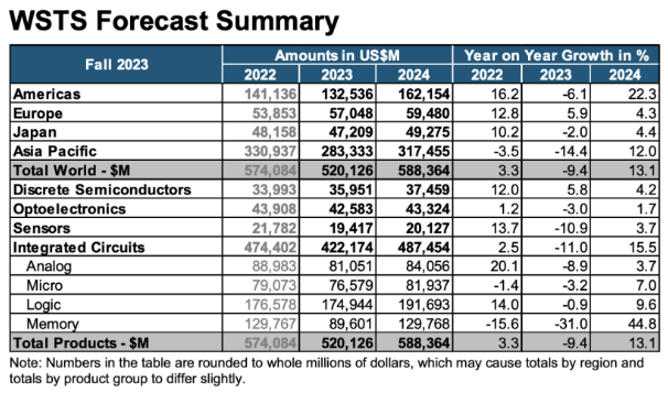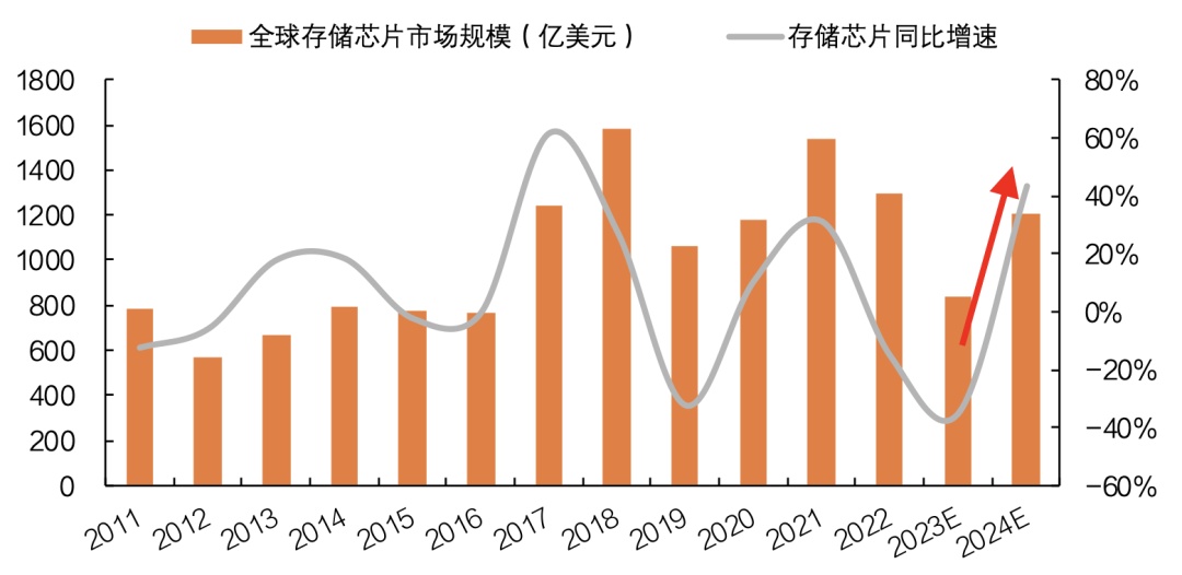 展望2024年,全球半导体市场将强劲增长,预计增长13.1%,规模达到5884亿美元。这一增长预计将主要由存储器行业推动,该行业有望在2024年飙升至1300亿美元左右,较上一年增长40%以上。
