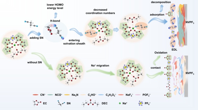 为了提高NVPF3基钠离子电池的高压稳定性,团队设计了一类含双-C≡N极性基团添加剂的二腈类电解液体系,通过和频共振光谱、原位电化学表面增强拉曼等表征方法和理论计算相结合。一方面,团队揭示了添加剂中-C≡N基团与溶剂(-CH2/-CH3)之间形成分子间氢键,使得另一个-C≡N基团更易进入溶剂鞘内层,降低溶剂配位数,从而减少了溶剂与正极界面接触进而发生氧化分解的作用机制,同时分子间氢键会降低电解液LUMO(Lowest Unoccupied Molecular Orbital)能级,从而提高电解液的抗氧化性。