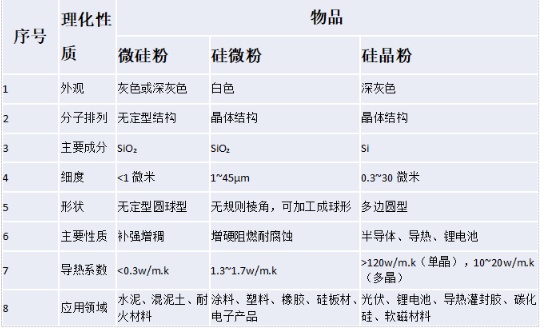 硅微粉、微硅粉、硅晶粉理化性质及应用对比