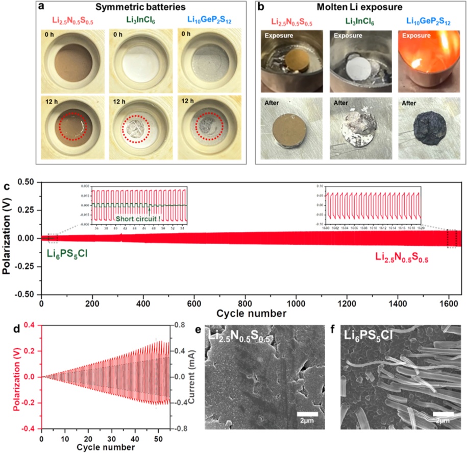 图5. (a) 固体电解质在对称电池中老化 12 小时前后的图片。(b) 固态电解质与熔融锂金属接触的图片。(c) 基于 Li6PS5Cl 和 Li2.5N0.5S0.5 固体电解质的Li-Li对称电池示意图。放大图对应循环开始后的 35-55 小时和 1600-1620 小时极化情况。(d) 使用 Li2.5N0.5S0.5 固体电解质的Li-Li对称电池极限电流密度测试。(e、f)在Li-Li对称电池中循环100小时后,Li6PS5Cl(f)和 Li2.5N0.5S0.5 (e)电解质表面的扫描电镜照片。