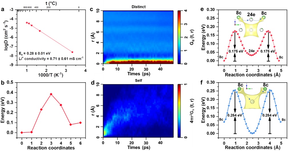 图4. (a)300K时的Arrhenius扩散系数图和外推法扩散系数图;(b)使用NEB计算的选定路径的锂原子迁移势垒。(e) Li2.5N0.5S0.5 和 (f) Li2S 中锂离子原子的迁移势垒,以及使用BSVE提取的等值为0.001的锂概率密度分布等值面。