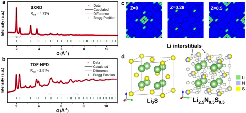 考虑到高价阳离子是无机固体电解质对锂不稳定的根源,本工作提出一种反式结构设计,以消除固体电解质化学组成中的非锂阳离子,从而获得对锂的本征热力学稳定性(图 1)。一般来说,传统固体电解质的骨架由以高价阳离子为中心的多面体构成,每个阳离子与六个或四个阴离子(通常是氧、硫和卤素离子)配位,例如,在最具代表性的Li10GeP2S12硫化物 SE 和 Li3YBr6 卤化物固体电解质中,分别是(Ge/P)S4四面体和YBr6八面体。高价阳离子(如Ge/P 和 Y)是维持电解质结构稳定性所必需的。相反,开发的反式结构具有相反的离子占位,阴离子占据多面体中心,而阳离子位于多面体顶点。这意味着Li+离子可以作为富锂反式结构多面体中唯一的阳离子配体,同时也可以作为 固体电解质的电荷载体。根据这一设计原则,研究人员近日成功合成了一种基于新型Li-N-S化学组分的锂传导反式结构--反萤石Li2+xNxS1-x (0 < x < 1)。这种电解质实现了室温下的高离子电导率和出色的锂兼容性。此外,通过中子和同步辐射 X 射线衍射的深入结构分析,首次揭示了反萤石结构中负责锂快速传输的锂间隙构型,工作推动了用于锂金属全固态电池的新型先进固体电解质材料的开发。