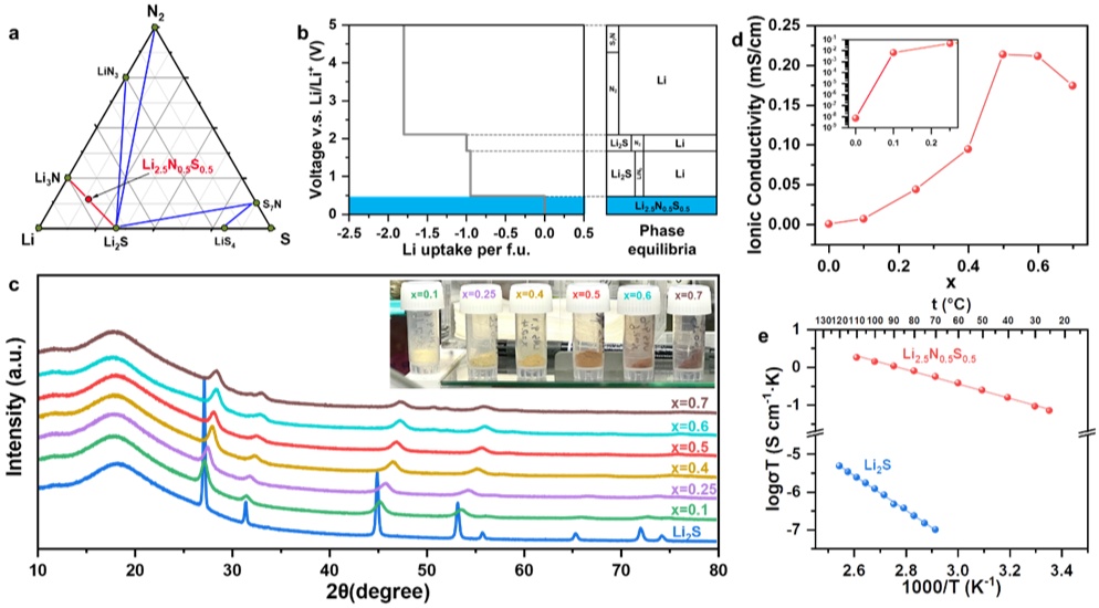 图2. (a)0K时Li-N-S系统的三元相图。(b)Li2.5N0.5S0.5的热力学平衡电压曲线和相平衡。蓝色部分表明,Li2.5N0.5S0.5与锂金属负极是稳定的。(c)Li2S和Li2.5N0.5S0.5的粉末X射线衍射(XRD)结果和光学图像(x = 0.1、0.2、0.25、0.4、0.5、0.6 和 0.7)。(d)Li2+xNxS1-x的离子电导率随组分变化情况。(e)Li2S和Li2.5N0.5S0.5的Arrhenius图。