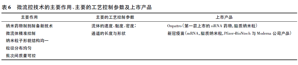有关微流控技术的主要作用、工艺控制参数及上市产品等简要总结见表。