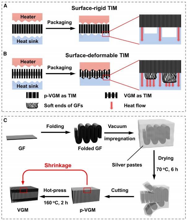 通常,在发热的元件和散热器中间填充热界面材料(TIMs),可以在两个表面形成良好接触,驱除其间热导率较低的空气,从而实现较好的散热效果。TIMs需要具有优异的可压缩性和适当的厚度,以满足器件设计和制造公差的要求,同时也能够符合粗糙的装配表面,以减少界面热阻。然而,由于散热性能有限,现有的商用TIMs无法满足功率密度显著增加的器件的需求。