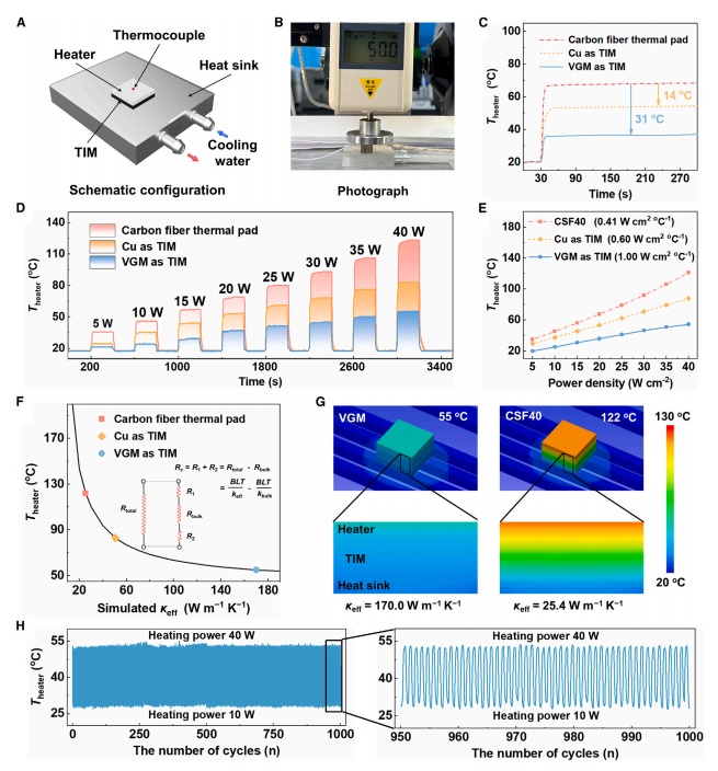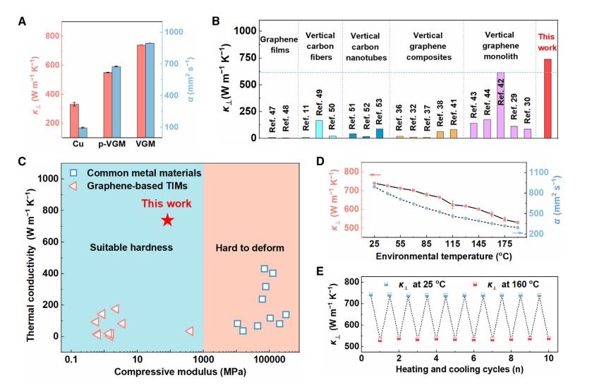 近日,武汉理工何大平、王哲团队针对用于高效散热的TIMs的开发取得最新进展。在这项工作中,基于垂直石墨烯单体(VGMs)内银浆的体积收缩,实现了超高kt (738.6 W/mK)和低r接触(29.2 Kmm2/W)的TIMs。出色的kt来自垂直排列的石墨烯薄膜(GFs),具有出色的面内导热性。此外,GFs之间的银浆加热后会收缩,导致GFs软端暴露,形成可变形的表面,从而实现r接触的显著降低。此外,受益于GFs的高面内导热系数,所得VGM TIMs在热管理测试中显示出优越的散热效率,分别比Cu和最先进的商用TIMs高66.7%和143.9%。与最先进的TIMs相比,VGM TIMs的散热效率提高了~2.44倍。该研究结果为先进的TIMs和热管理应用提供了实用的设计指南。研究成果以“Deformable surface design of vertical graphene thermal interface materials for efficient heat dissipation”为题发表在《Cell Reports Physical Science》。