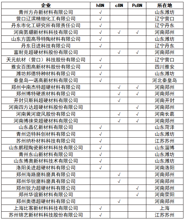 目前,国内从六方氮化硼到立方氮化硼再到聚晶立方氮化硼,已经初步形成了完整的产业链条。部分氮化硼生产企业及生产情况如下: