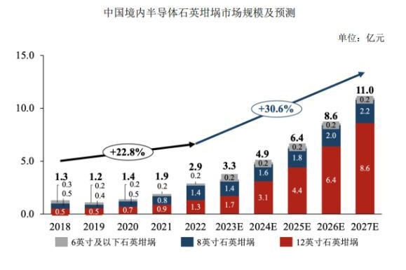 从需求端来看,2022年中国境内半导体石英坩埚需求量占全球需求总量的15.93%。随着中国半导体硅片产业的蓬勃发展,中国境内半导体石英坩埚市场需求也将快速上升,据中金企信预测,2027年中国境内半导体坩埚市场规模有望从2022年的2.9亿元增长至11亿元,年复合增长率30.6%。