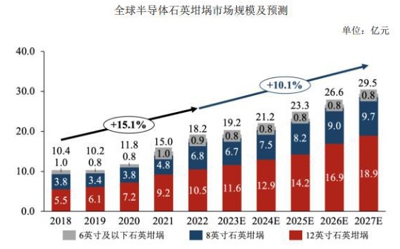 在半导体石英坩埚领域,国外半导体产业逐渐转移至国内,随着新能源车、智能电网、自动驾驶、人工智能的发展,8 英寸及 12 英寸半导体硅片出货量持续增长,我国半导体硅片供应商开始加码大硅片产能布局,对半导体石英坩埚的需求持续增加,预计至 2027 年,全球半导体石英坩埚市场规模将扩大至 29.5 亿人民币,期间年复合增长率为 10.1%。目前,国内个别企业开展了 32 英寸半导体级石英坩埚的研发工作并具备量产能力。