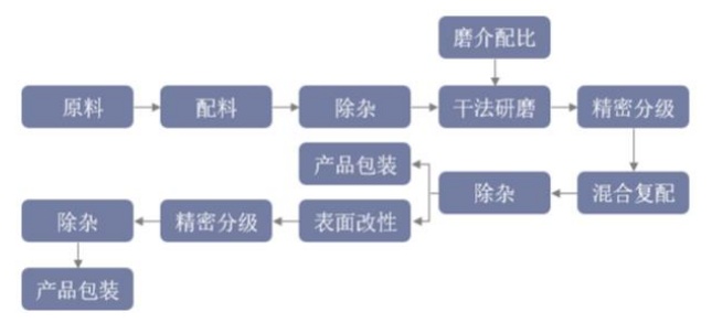 干法研磨是将硅微粉原料放进球磨机或振动磨中研磨,该研磨工艺可以连续进料和出料,也可以一次投入若干重量原料,连续研磨若干时间后出料;出料时要经过微粉分级机控制粒度,粗的产物返回磨机再磨或作为产品,细的则是产品。干法研磨要严格控制入磨物料水分,产品不再干燥。
