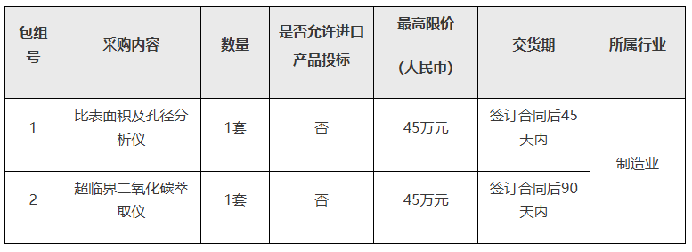 合同履行期限:比表面积及孔径分析仪:签订合同后45天内;超临界二氧化碳萃取仪:签订合同后90天内。