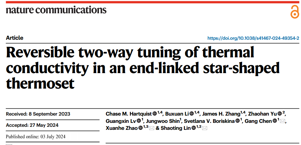 中国粉体网讯 近日,麻省理工大学陈刚、赵选贺和林少挺团队针对用于在电子,航空航天,汽车等领域的聚合物热开关取得最新进展。研究成果以“Reversible two-way tuning of thermal conductivity in an end-linked star-shaped thermoset”为题发表在《Nature Communications》。