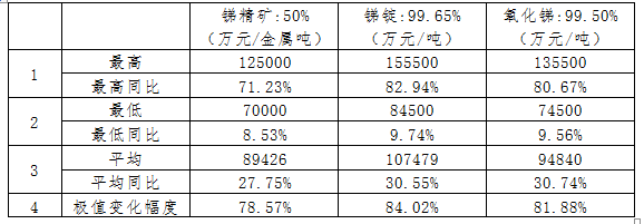 截至6月30日,2024年国内锑精矿平均价格8.94万元/金属吨,同比上涨27.75%,其中最高价格12.5万元/金属吨,最低价格7.00万元/金属吨;锑锭平均价格10.75万元/吨,同比上涨30.55%,其中最高价格15.55万元/吨,最低价格8.45万元/吨;氧化锑平均价格9.48万元/吨,同比上涨30.74%,其中最高价格13.55万元/吨,最低价格7.45万元/吨。