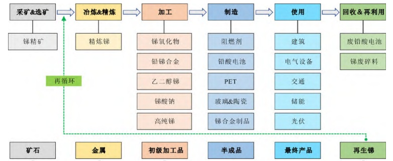 从元素生命周期的角度看,锑产业链可划分为六个阶段,分别为:采矿&选矿、冶炼&精炼、加工、制造、使用、回收&再利用。