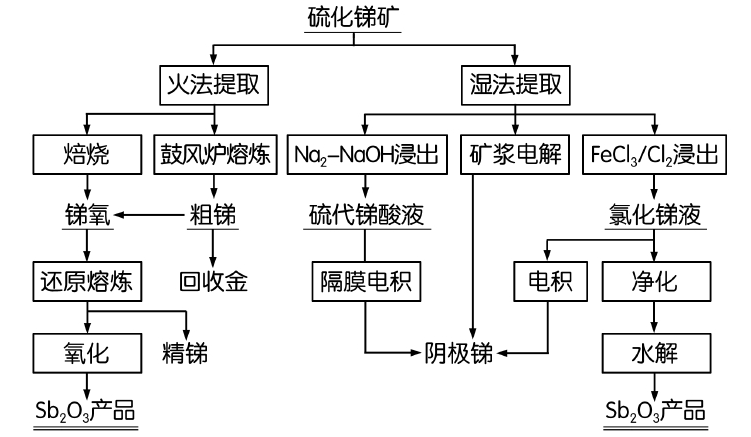 目前已知的含锑矿物达120余种,具有工业冶炼价值的有辉锑矿(Sb2S3)、方锑矿(Sb2O3)、锑华(Sb2O3)、锑赭石(Sb2SxOy)、黄锑华(Sb2O4·H2O)等。其中,辉锑矿是锑冶炼的主要矿物原料,利用其生产的金属锑占总产量的60%以上。锑矿物按赋存类型可分为氧化矿、混合矿、硫化矿3种,目前以硫化矿为主,包括硫化锑矿、脆硫锑铅矿、硫化铜(砷)锑矿。目前锑的提取以硫化矿为主,冶炼方法分为火法工艺和湿法工艺,以火法冶炼为主,湿法炼锑根据反应体系的不同又分为酸性体系和碱性体系。