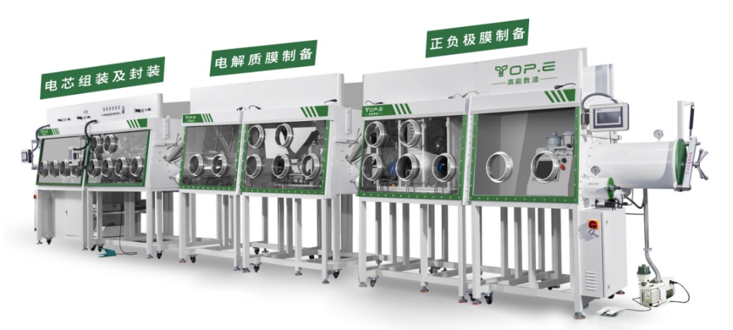 高能数造全固态电池干法小试线,可实现材料纤维化、制膜、复合、裁切、叠片、极耳焊接、封装、电芯致密化等工序,完成全固态电池的全流程制备。