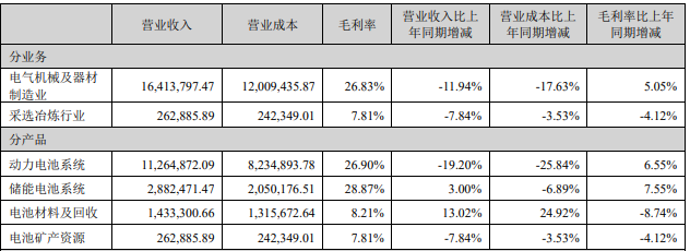 报告期内,在动力电池系统、储能电池系统、电池材料及回收、电池矿产资源等分产品上,宁德时代分别实现营业收入1126.49亿元、288.25亿元、143.33亿元、26.29亿元,其中动力电池系统、储能电池系统毛利率同比分别提升6.55%和7.55%。