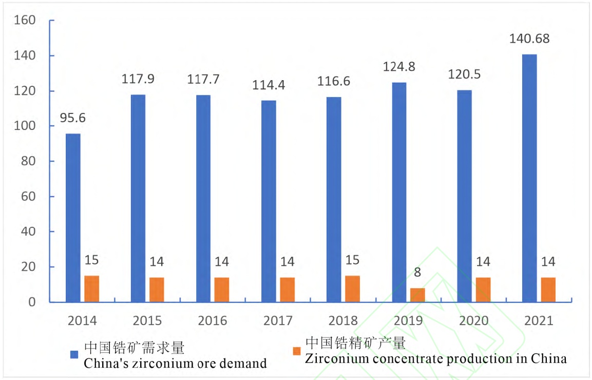 2014-2021年中国锆精矿产量及锆矿供需情况(单位:万吨)