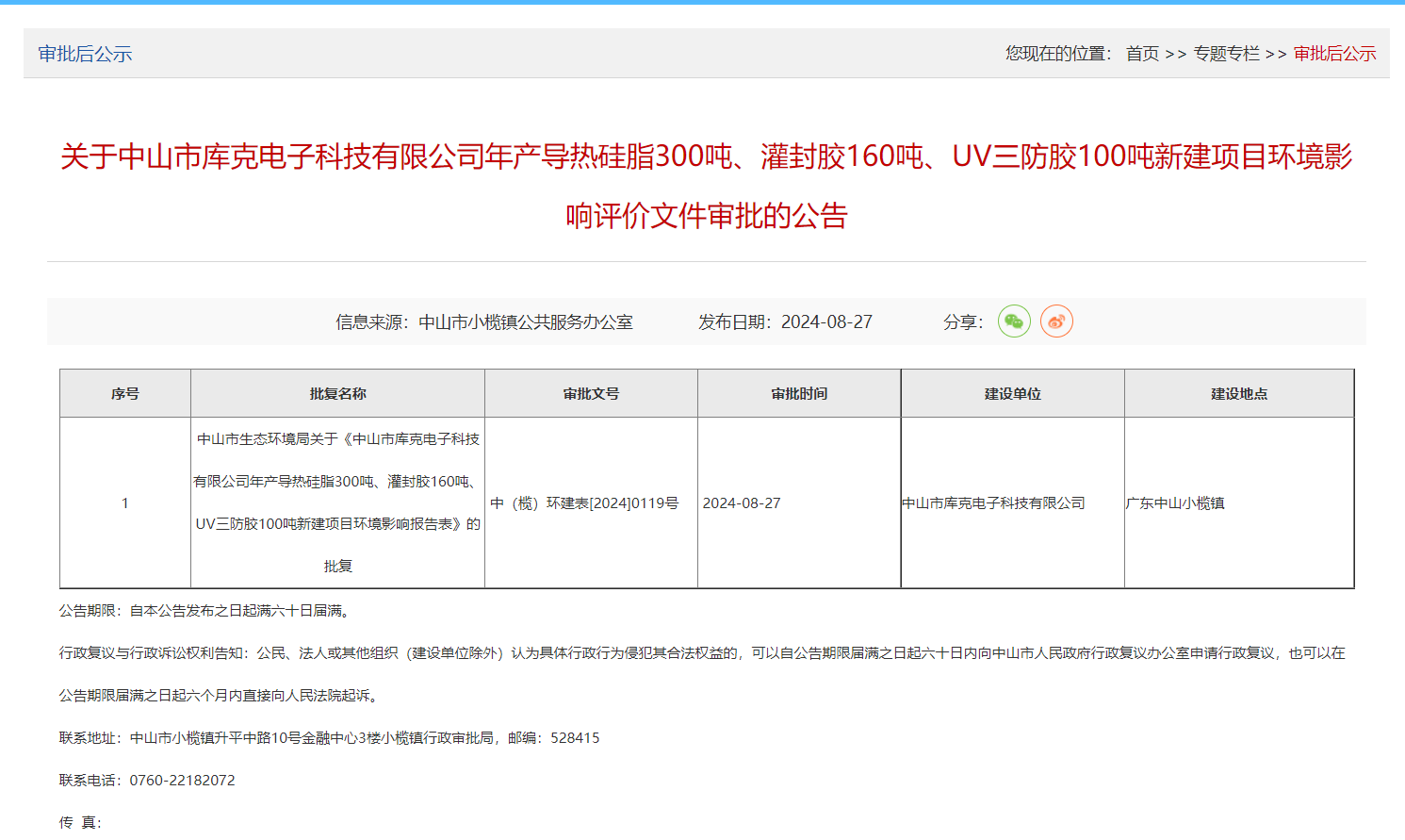 中国粉体网讯 近日,中山市生态环境局审批机构发布对中山市库克电子科技有限公司年产导热硅脂300吨、灌封胶160吨、UV三防胶100吨新建项目环境影响评价文件作出批准决定的公示。