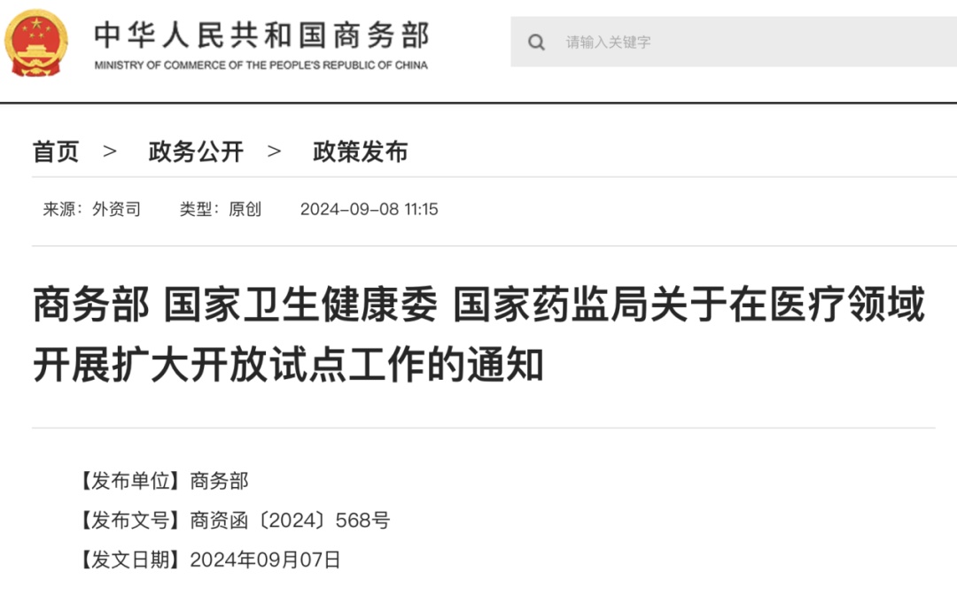 9月8日,商务部、国家卫生健康委和国家药监局印发《关于在医疗领域开展扩大开放试点工作的通知》,涉及生物技术以及独资医院两大领域开放,外商在华医疗投资迎来重大利好。