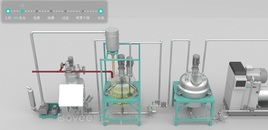 图为:博亿医药智能化产线,解决方案涵盖小袋解包站——上料系统——研磨——过滤——喷雾干燥——自动罐装