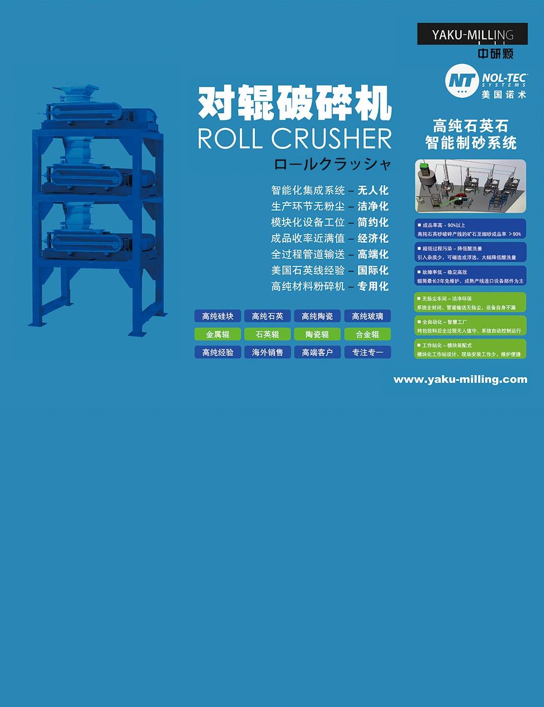 公司生产制造日本对辊机设备,原料粉碎粒径可达0.5mm,出料双重粒径控制系统确保粒径均匀,不漏粉不卡料不污染原料。