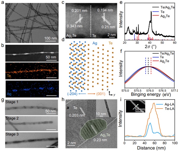 Te/Ag2Te一维分段异质纳米结构的形貌和结构表征。
