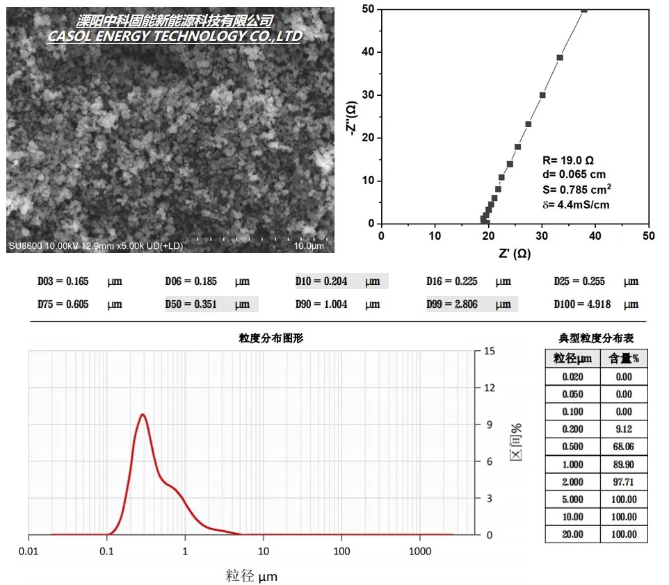 离子电导率随粒径的降低而减小是目前硫化物电解质细化面临的一大技术难点,中科固能通过筛选适配溶剂、调控细化工艺,制得小粒径高离子电导型材料CSE-SSE-P004,将粒径控制在D50<1μm,D90<3μm,保证粒径细化到亚微米甚至纳米级别时,仍能保持>10mS/cm的较高离子电导率,解决了同时兼具小粒径与高电导率的技术难点。