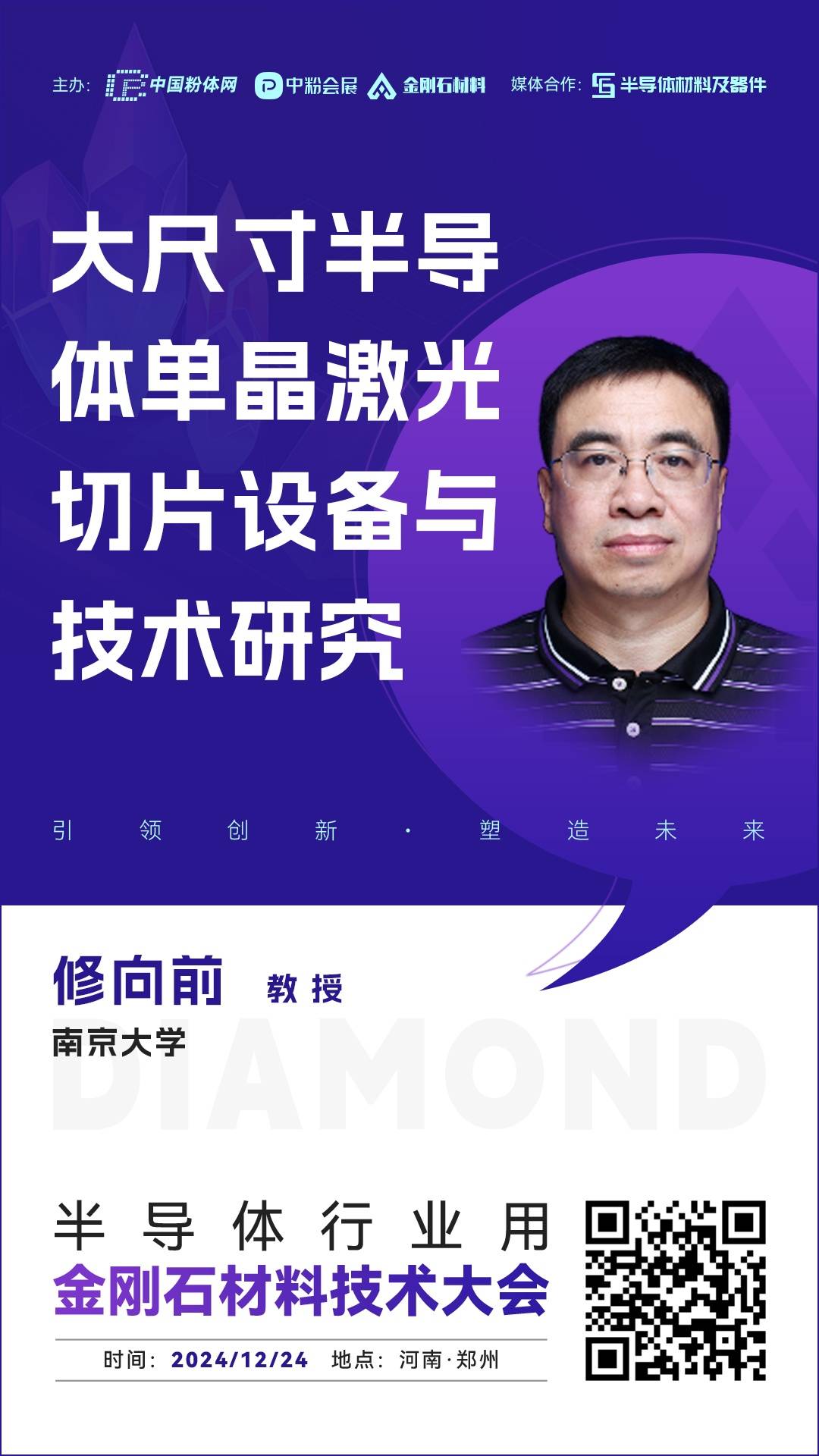 2024年12月24日,中国粉体网将在河南·郑州举办“2024半导体行业用金刚石材料技术大会”。届时,我们邀请到南京大学修向前教授出席本次大会并作题为《大尺寸半导体单晶激光切片设备与技术研究》的报告,修教授将为您具体介绍大尺寸半导体单晶激光切片设备的研究进展及规模化应用展望。