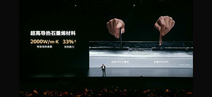 中国粉体网讯 11月26日,在华为Mate品牌盛典上发布了最新款折叠屏手机Mate X6,其采用革新散热技术,搭载分布式玄武架构还采用了超高导热石墨烯材料,散热效果提升33%。余承东介绍用这一材料切冰块就像切豆腐一样,通过手的温度传导到石墨烯散热片上切割冰块如同切豆腐一般丝滑,直观展现其强大导热能力。发布会结束后的现场体验环节人们也是争相体验这一“神奇”的技术。