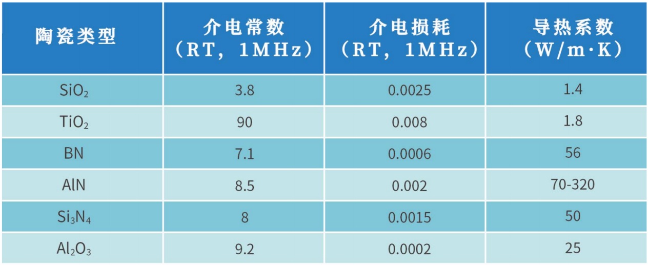 常见陶瓷材料的介电性能和导热系数表
