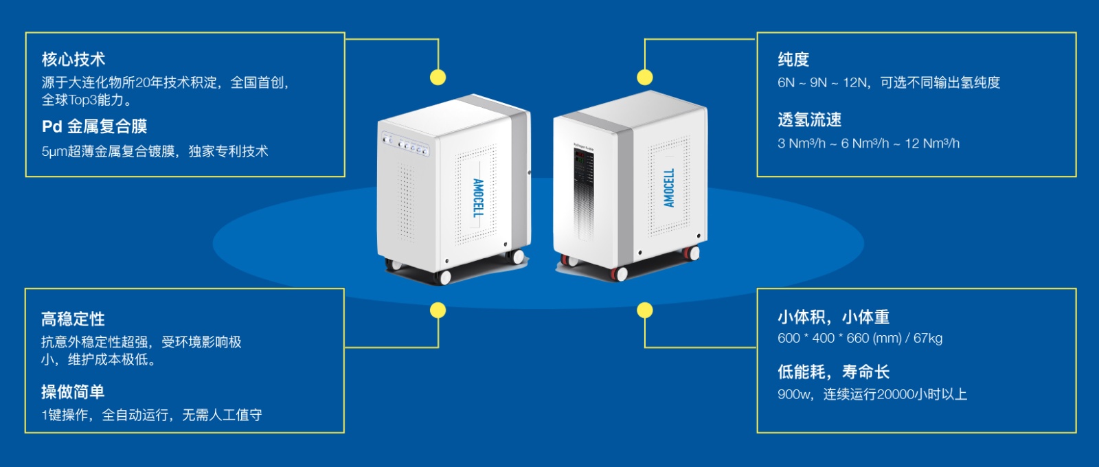 来自中科院⼤连化物所,20年研发积累,独家超薄⾦属钯复合膜技术,⾼质量实现氢提纯能⼒。获得国家发明专利两项。全国第⼀,全球TOP3。