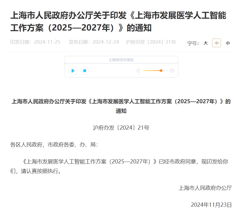 中国粉体网讯 12月24日,上海市人民政府办公厅印发《上海市发展医学人工智能工作方案(2025—2027年)》,其中提到,建设人工智能药物研发平台:建设小分子创新药物筛选和优化平台,实现基于靶点动态结构的先导化合物发现、药效评估和老药新用等。建设大分子生物医药大模型干湿迭代设计平台,发展大模型与低通量湿实验一体自动化技术,实现蛋白质粒构建、表达、纯化、性能检测等低通量湿实验的全过程自动化,加速产品研发。打造全领域应用场景:人工智能与中医药深度融合、人工智能与药械研发深度融合等。