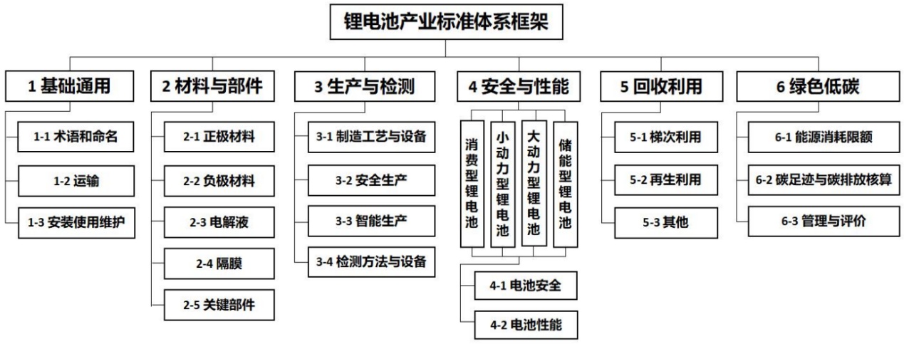 锂电池产业标准体系框架包括基础通用、材料与部件、生产与检测、安全与性能、回收利用、绿色低碳等6个部分。