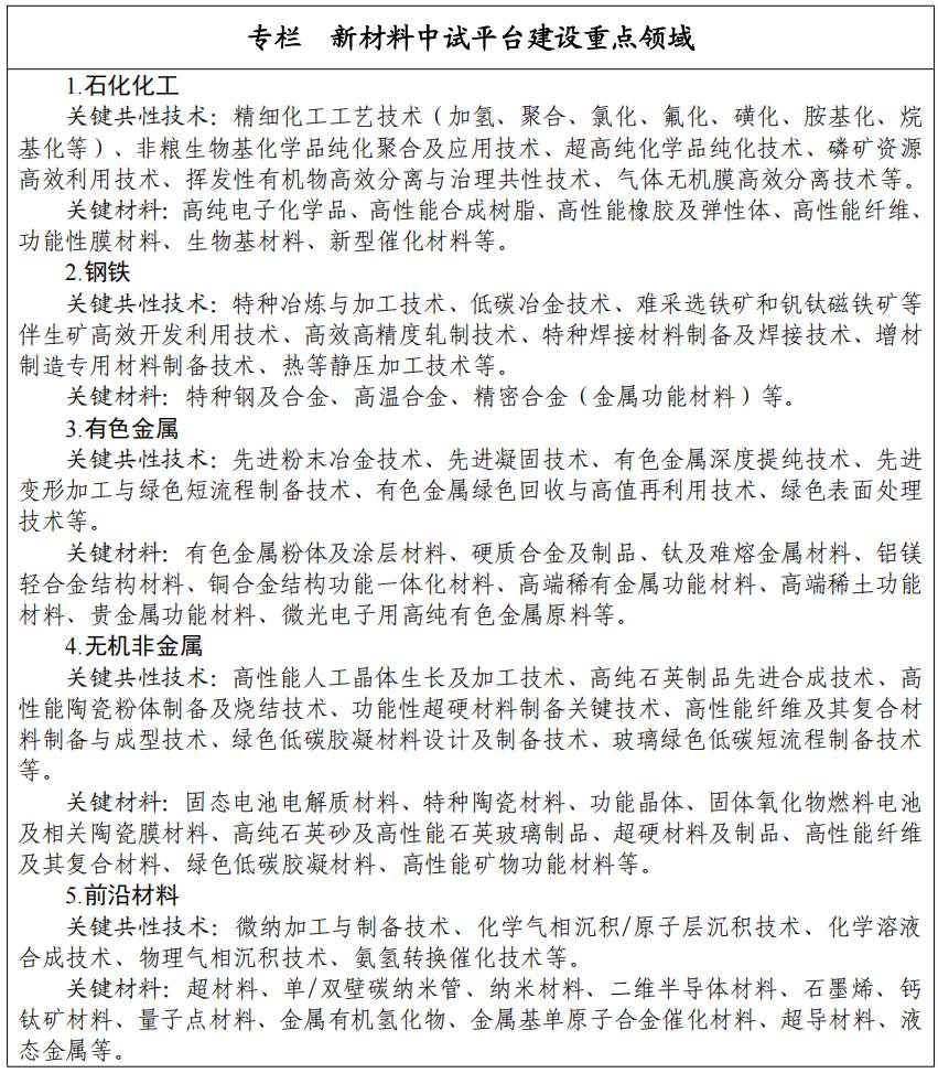 围绕加快推进新型工业化、建设制造强国战略需求,着眼事关国家安全和经济建设的关键短板材料、引领新兴产业和未来产业发展的前沿材料,聚焦“触类旁通”效应明显、行业进步带动性强的关键共性技术,确定新材料中试平台建设的重点领域。