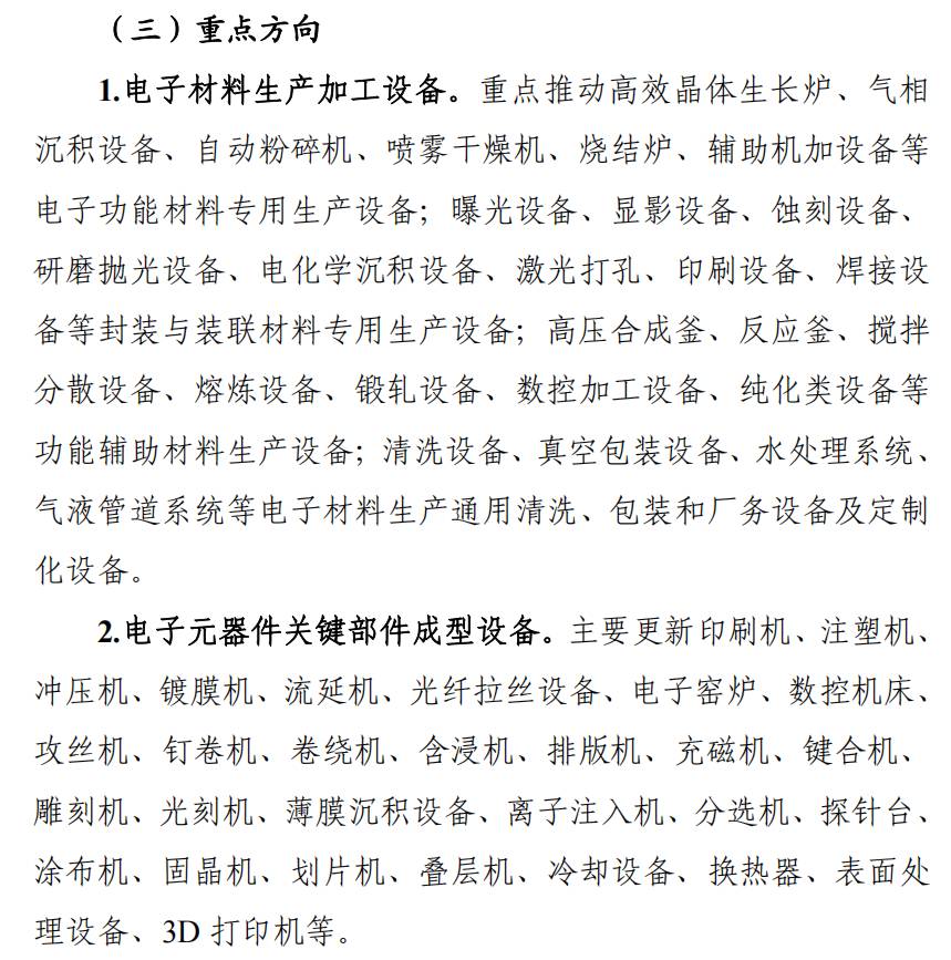 对于电子元器件和电子材料行业,提出争取到2027年,全行业设备改造后,基本满足我国电子元器件、电子材料产业及相关行业对高性能、高效率、智能化、绿色化生产检测设备的使用需求,部分领域行业龙头企业的设备水平达到世界一流。重点方向包括电子材料生产加工设备、电子元器件关键部件成型设备、电子元器件加工组装设备、电子元器件与材料先进检测设备、工业操作系统、工业软件。