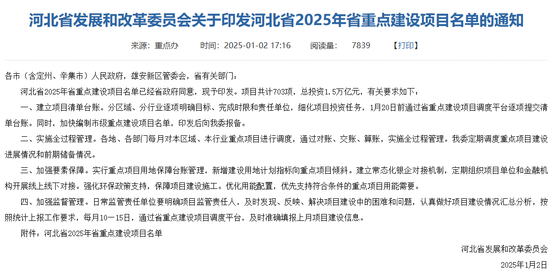 中国粉体网讯 近日,河北省发改委印发《河北省2025年省重点建设项目名单》,项目共计703项,总投资1.5万亿元,包括新开工项目349项,续建项目259项以及建成投产项目95项。