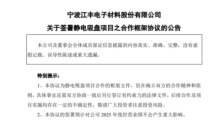 中国粉体网讯 近日,宁波江丰电子材料股份有限公司发布公告称,公司于2025年1月17日与KSTEINC.(以下简称“KSTE”)签署了《关于静电吸盘项目之合作框架协议》(以下简称“本协议”),公司拟向KSTE引进静电吸盘生产技术及采购静电吸盘生产线。