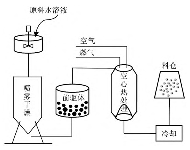 喷雾造粒法制备空心玻璃微珠的主要原理是使用压力、离心或气流式雾化器将含有玻璃粉和发泡剂的悬浮液雾化,液滴中的液体在蒸发后成为坯体,将坯体送入烧结炉中烧结形成空心玻璃微珠。