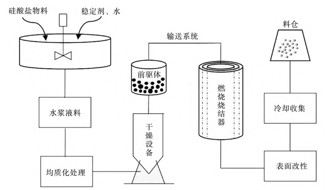 喷雾干燥法具有坯体形成稳定方便,生产效率高,产品空心率高,成本相对较低等优势,被广泛认为是一种可以用于工业化生产空心玻璃微珠的方法,但此种方法生产出来的微珠物理和机械性能要低于玻璃粉末法生产的微珠,且化学稳定性差。
